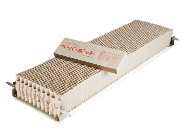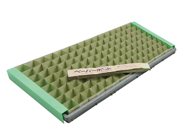 「ペーパーポット」は特殊加工した紙で作られた折りたたみ式の育苗鉢です。てん菜を始めとした蔬菜、花き、林木などの育苗に広く使われています。通気性・浸水性に優れており、均一で高品質な苗が生産でき、紙が根を保護するため根傷みが少なく、効率良く定植できます。