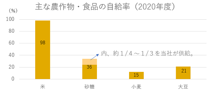日本の食料自給率は約37%(カロリーベース、2020年度数値)ですが、その中で砂糖は米、野菜、魚介類に次いで高い自給率(カロリーベースで36%、2020年度数値)を持つ食品となっております。
