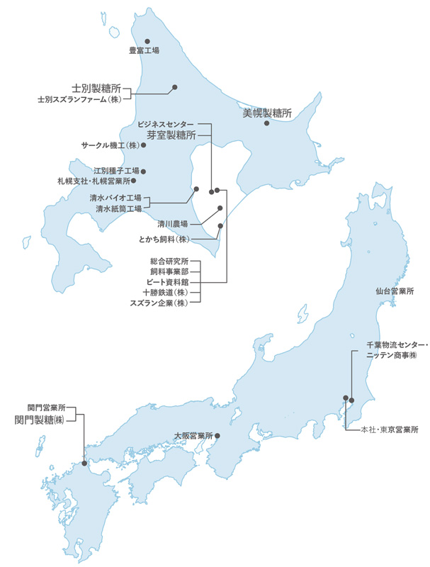 どちらの原料からも同じお砂糖が生産されています。ビートは北海道農業の基幹作物として畑作の輪作体系に取り入れられています。生育期間は約6ヶ月、春先に植え付けられ、秋に収穫されます。その後生産地近くの製糖工場へ運ばれお砂糖が作られています。さとうきびはその多くを海外(タイ・豪州など)から粗糖として輸入され、 国内消費地近くの工場できれいに精製されお砂糖が作られています。当社ではビート糖を芽室製糖所、美幌製糖所、士別製糖所で生産し、精製糖は関門製糖(株)に生産を委託しております。